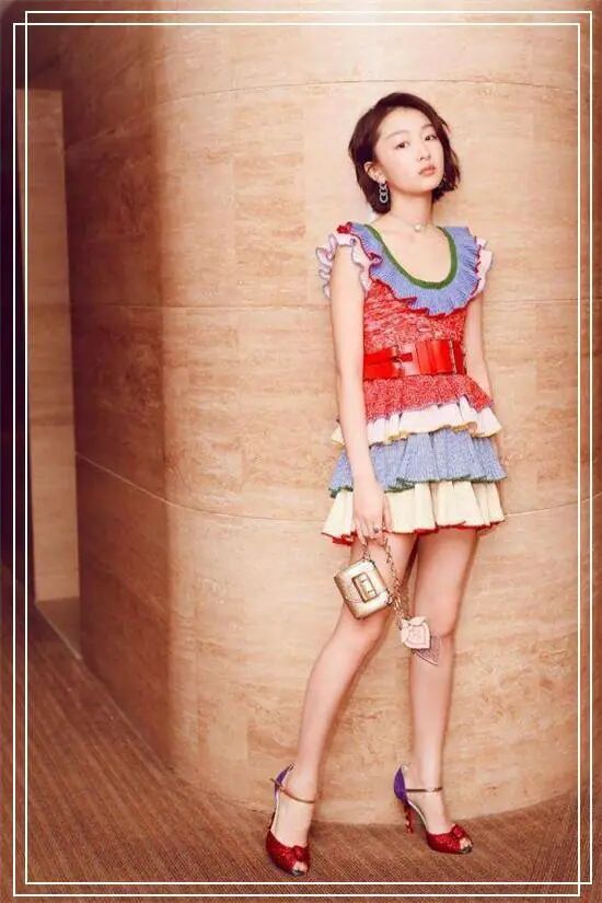 这条针织裙的颜色看起来比较繁多,可是穿在周冬雨的身上,却是一点也不显俗气,反而是给人一种少女感,同时这种短款的设计还拉长了身材比例。