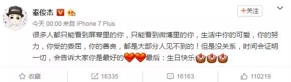 11月6日是杨紫的生日,凌晨,男友秦俊杰准时为女友杨紫送上生日祝福,并敞开心扉心疼女友连日来受到的委屈。秦俊杰发文:“很多人都只能看到屏幕里的你,只能看到微博里的你,生活中你的可爱,你的努力,你受的委屈,你的善良,都是大部分人见不到的!但是没关系,时间会证明一切,会告诉大家你是最好的。最后:生日快乐”。随后,杨紫也留言回应:“谢谢陪伴,你懂。”深夜被狂撒了一把狗粮啊!