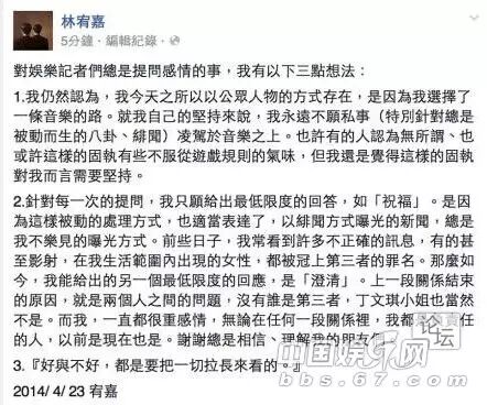 后来林宥嘉也是不胜困扰,出了声明,仔细看哦,其实第二条很明显就是在反击邓紫棋,不回复不是默认,只是不想给有(邓)心(紫)人(棋)炒作,啧啧啧。 回想林宥嘉也是挺可怜的,,,这一路被炒作过来。。。。一个喜欢低调一个喜欢高调,注定就不会长久嘛!