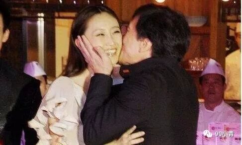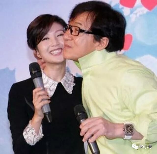 成龙和刘亦菲合影,低头捡起地上掉的东西。
