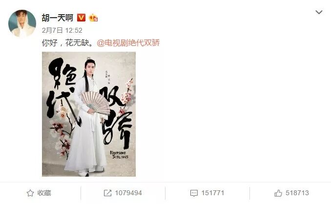 2月7日,胡一天在微博发布定妆照,正式坐实自己饰演花无缺的传闻