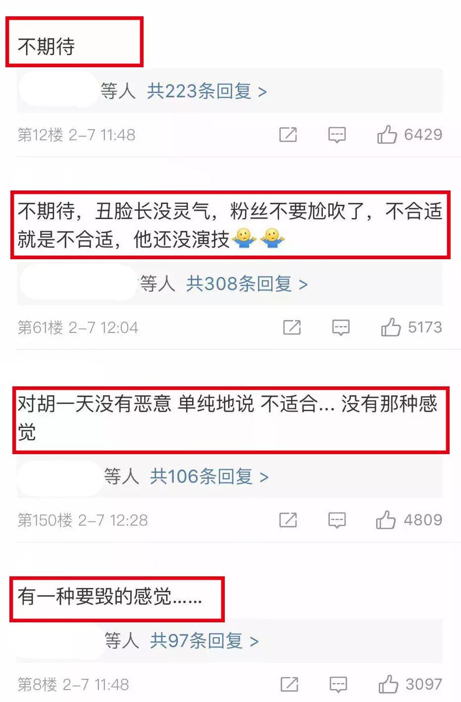 在官宣的微博下,满屏都是“不期待” 、“没演技”、“不合适,没那种感觉”、“有一种要毁的感觉”等反对的声音