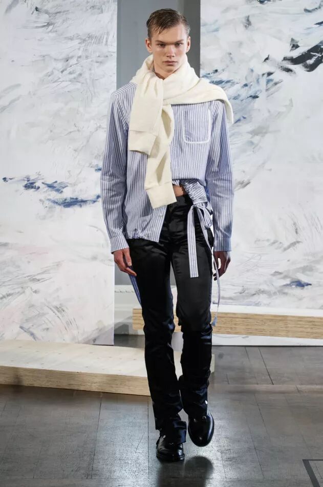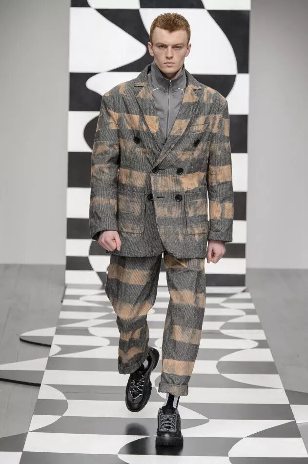 Alex Mullins以左右脑不同的功能为灵感。他的作品采用一系列扎染、醒目拼接条纹或灰调色泽,配以破碎陶器作为装饰或印有破碎陶器的图案。优雅西装完美搭配不拘一格的街头风单品,形成绝妙视觉效果。