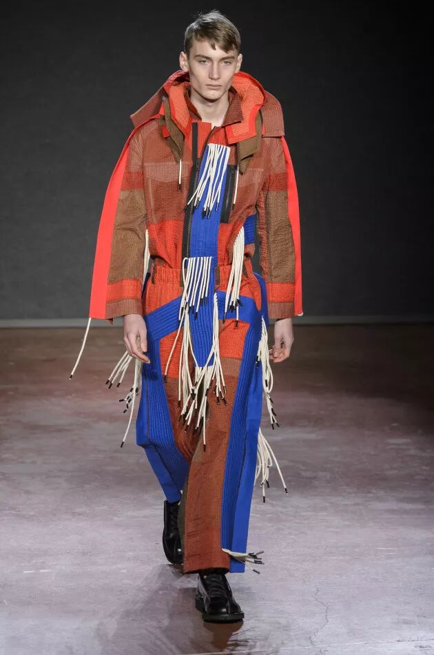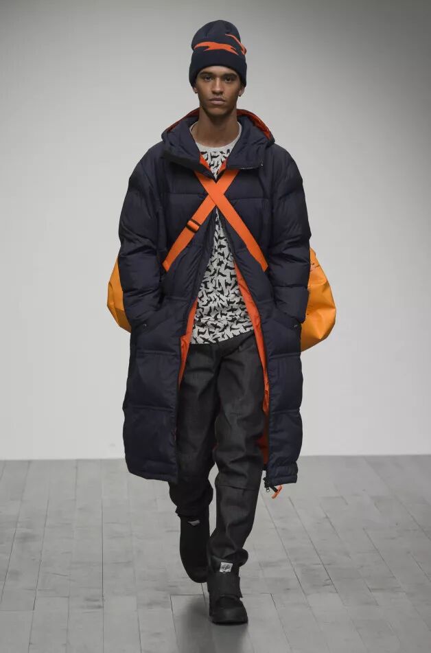 这场以海洋为核心的T台秀反映该设计师的“重构”理念,翻新浸水保温服和英国空军直升飞机开关手的工装裤。防风雨的结构采用醒目的线缝细节、防水拉链和援救口哨,运用于外套和长裤。Christopher Raeburn翻新带图案的俄罗斯和丹麦海军毛毯,彰显创意才华。