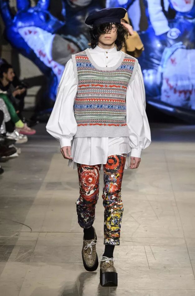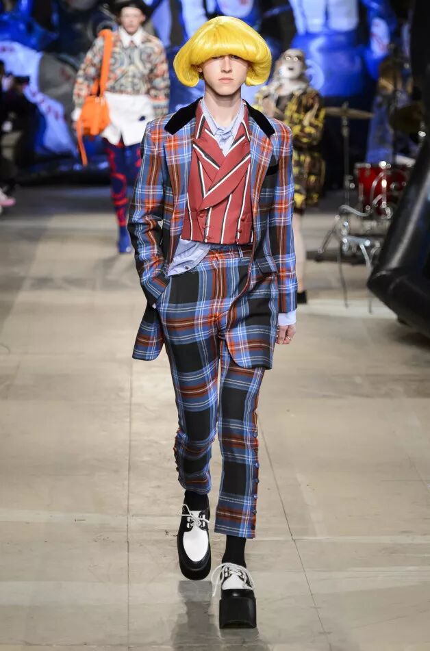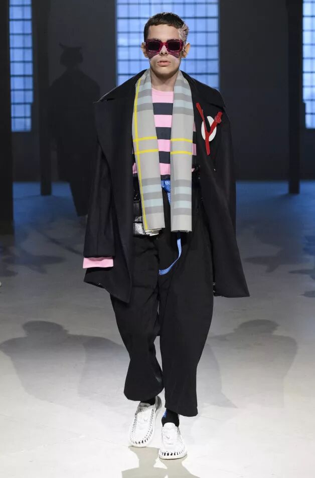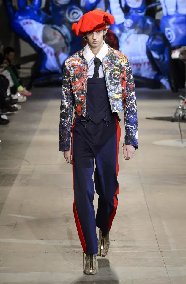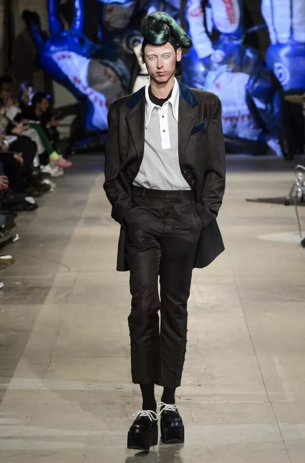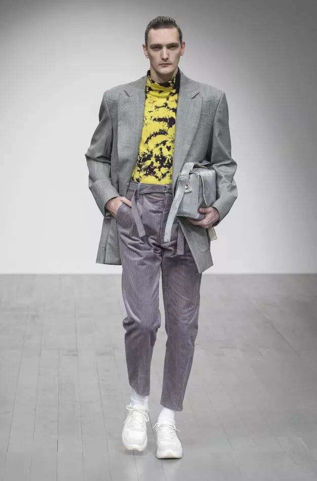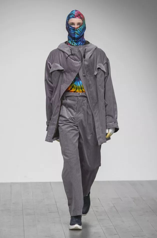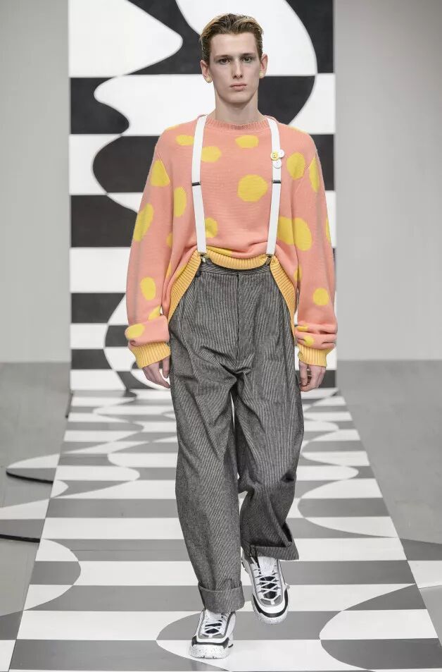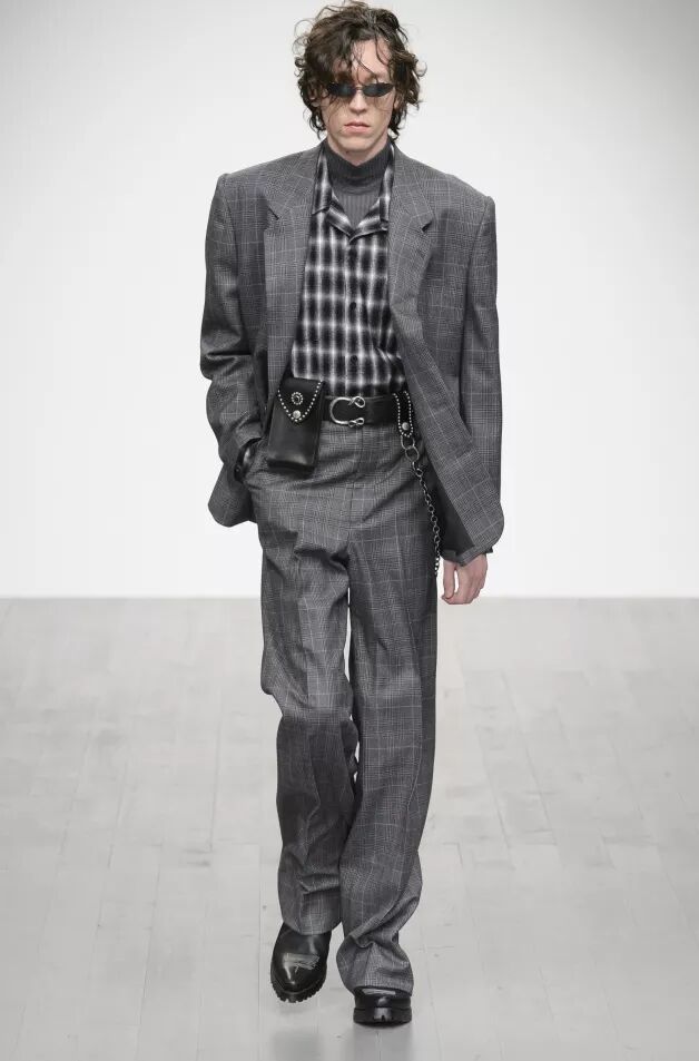 Liam Hodges致力于打造“适合舞池、公园和酒吧的服装”,表达快乐主义。丹宁经过手工喷涂,羊毛西装面料带有漂白条纹。身着运动装的顽皮少年成为灵感来源。受David Byrne风格启发的西装采用摇滚条纹、格纹和Mr Blobby式的镶嵌针织,诠释千禧年之前的叛逆文化。