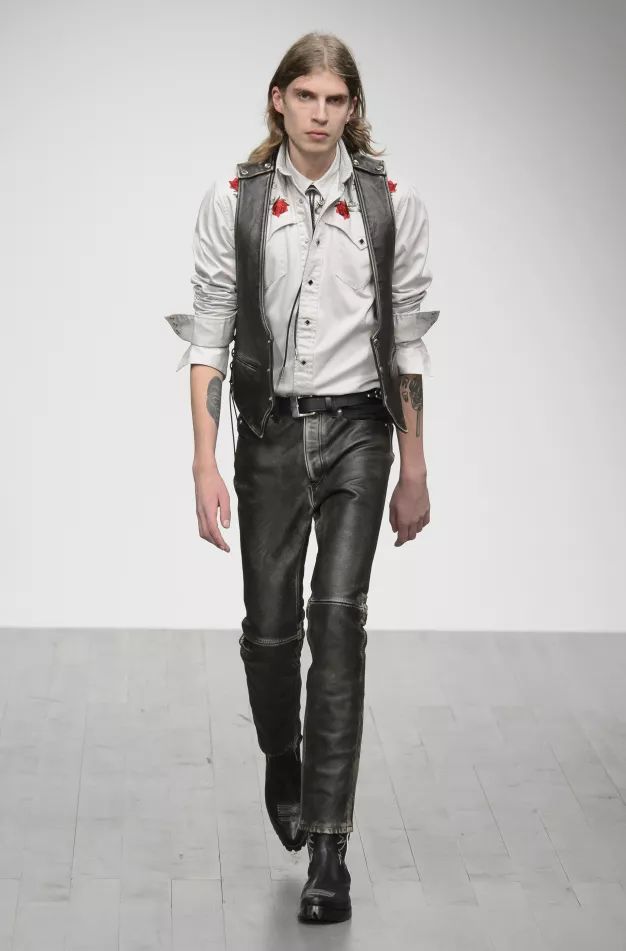《黑客帝国》中身着皮革服装的邪恶人物契合John Lawrence Sullivan作品的“变态杀手”格调,其作品参考《双峰》和《出租车司机》。暗黑风格的套装把玩纹理,从皮革到针织,而午夜紫色调则营造孤独寂寞的氛围。皮革配饰、银色金属配件和牛仔靴透出硬朗、恋物的美国西部气息。