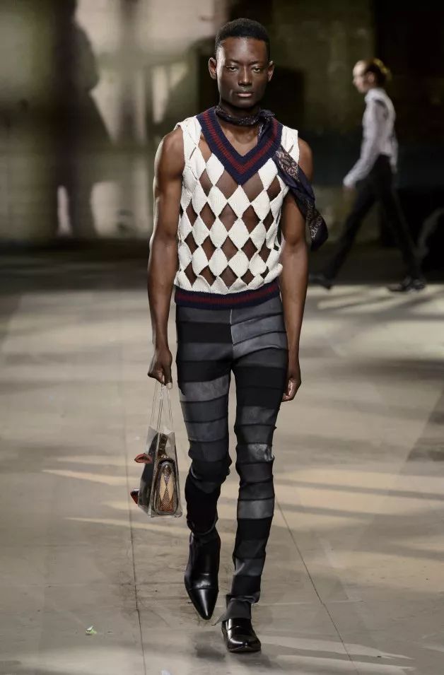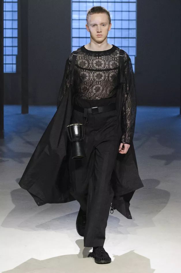 在伦敦布鲁姆斯伯里的一座教堂中,戏剧感十足的模特巍巍走来,单品反映出人类对探险的痴迷。以Leah Gordon的书作《Kanaval》为灵感,海地南部狂欢者启发面料、细节和造型,以及量感夹克和西装。蕾丝为男性化的西装面料和乐活的柔和粉红色格纹赋予女性化格调。