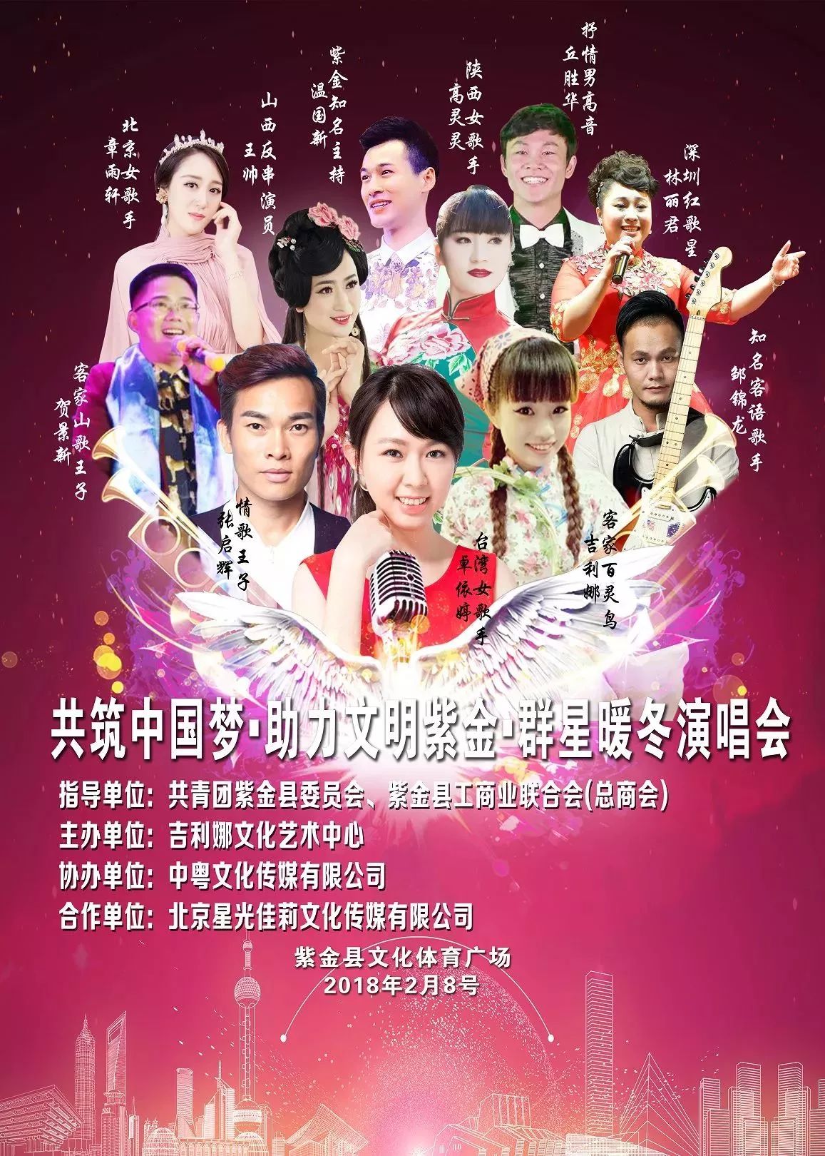 《共筑中国梦▪助力文明紫金▪群星暖冬演唱会》作为全县瞩目的大型公益文化活动,得到了县委县政府的大力支持,共青团紫金县委员会,紫金县工商联总商会作为本次活动指导单位,吉利娜文化艺术中心作为主办单位,中粤文化传媒有限公司作为协办单位。本次活动邀请群星助阵,可谓是紫金县文艺界的一大盛事。目前已邀请到影响了老中青少几代人的重量级歌星卓依婷前来助阵,并邀请了众多参加过央视或各卫视频道等大型综艺节目的名气歌手,影响本县人数超过80万人,是紫金县演艺界的一大盛事。