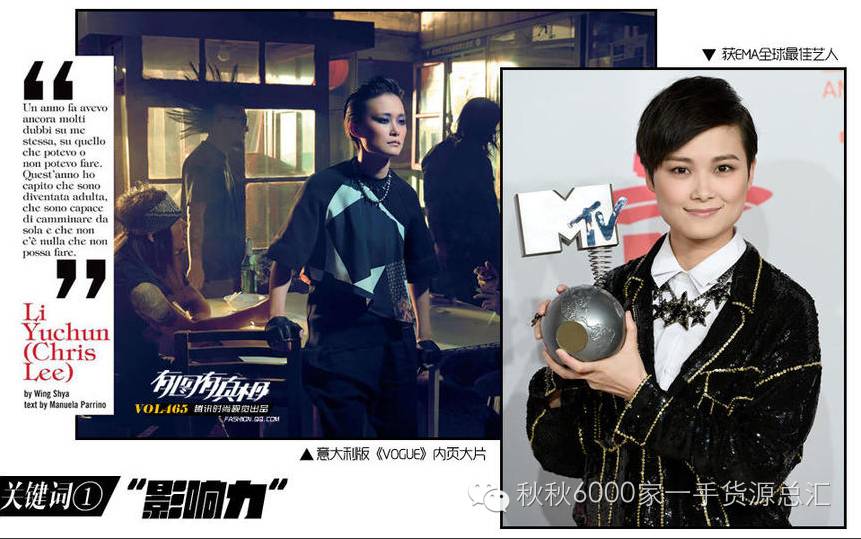 “影响力”无疑是品牌衡量代言人的首要指标。所有代言合约都是建立在商业利益的驱动下,奢侈品为何要找明星代言?如果说演绎服装,身材完美气质高冷的模特无疑是更好的人选。然而明星在大众市场上的号召力则是小众的模特无法媲美的,其形象所附加的无形商业价值是品牌近年来越来越重视明星代言人的原因。当年Julia Roberts身着Valentino礼服出席奥斯卡拿下小金人,这一曝光据测算相当于1000万美元广告的价值。而李宇春,作为中国最早的“民选偶像”,出道十年已经积攒了一个相当庞大而忠诚的粉丝群体,百度一下她的个人成就,不乏WMA、EMA等世界级音乐颁奖礼的认可,在中国乐坛中实属罕见。同时,她还是第一个登上意大利版《VOGUE》内页的中国女歌手。无论是从群众基础、专业成就或国际时尚圈认知度的角度,李宇春都会成为大牌在寻觅代言人时优先考虑的选择。