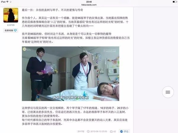但是当96版的琴子客串到13版当护士,她看着13版熟睡的琴子和宠爱她的入江,96版的琴子说,想起来,我也有过这么美好的岁月呢!(说实话,我被这个地方击中了。嫁给入江的,人到中年的琴子还幸福吗?童话会结束吗?)而96版的江直树也在13版客串了一个医生,十七年过去了,当年的怀抱着当医生的梦想的入江,也成了疲惫的中年人了呢!
