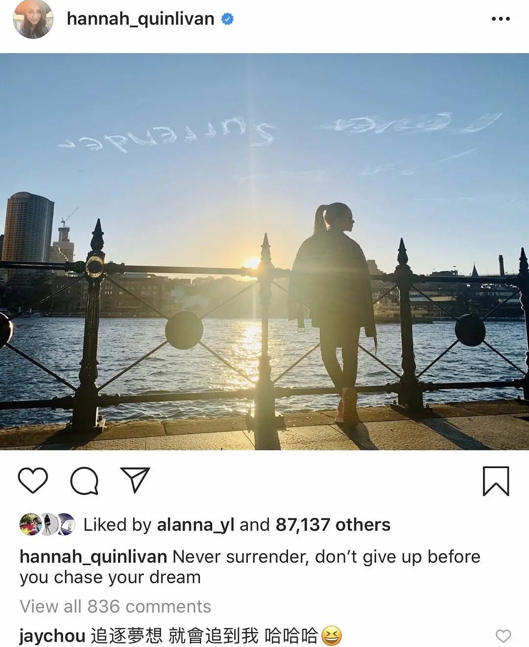 周杰伦在IG上发了一段视频,无人机在天空上写着“never surrender ❤️Lachie”。