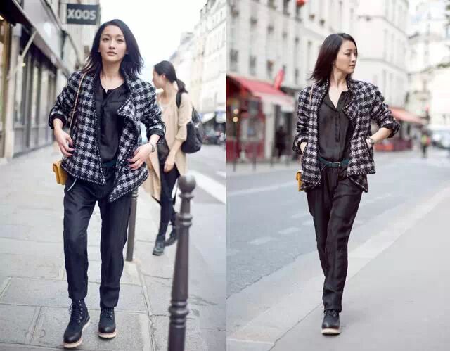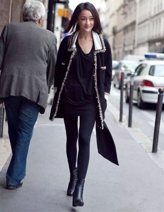 香奈儿碎花边外套高端优雅,搭配丝滑黑色打底衫和打底裤,展露出身材曲线,体现性感女性韵味。
