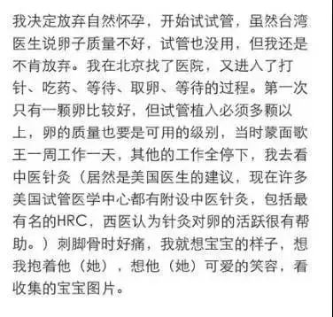 伊能静很幸运,不仅仅是她高龄自然受孕,更因为她有一个支持她、理解她、包容她的家庭。影响怀孕的因素很多也很复杂,单从试管婴儿来讲,在超排卵方案和实验室方案不变的情况下,心理因素就成为影响成功率的一个重要因素。长期的情绪压力会刺激肾上腺皮质激素过度分泌,导致雄激素过多而影响排卵。情绪剧烈的起伏会使交感神经兴奋,释出儿茶酚胺,阻碍卵巢中滤泡的生长与黄体生成素的分泌。最终会影响试管婴儿治疗过程中控制性超排卵的效果,增加怀孕的困难性。