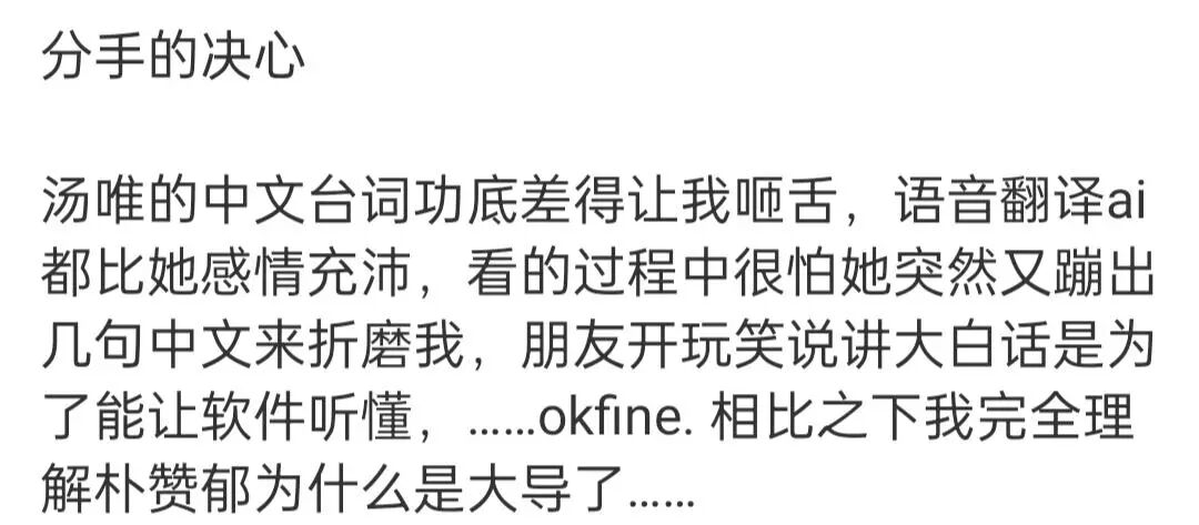 朴赞郁导演,本来是很会拍女人的。 《小姐》里多种装束、美艳至极的金敏喜,和灵动活泼的金泰梨给中国观众留下了极深的印象。前者拿下韩国电影青龙奖最佳女演员,国际影响力更上一层;后者更是凭《小姐》拿下包括青龙奖在内的八个最佳新人演员奖,并在今年勇夺百想奖视后荣誉。与其说汤唯演技不行,不如说一向出手稳准狠的朴赞郁朴导,怎么这次不会拍女人了?原因无二,汤唯是朴赞郁导演的真·女神啊!朴赞郁的御用编剧郑景瑞说,如果我写爱情故事,女主角只能是汤唯。朴赞郁:没问题,你就开写。 在电影剧本完成之前就完成女主角的选角是很少见的。朴赞郁导演拍电影一向都在女主角身上犯困难症。《小姐》里,金泰梨的角色是面试了1000多名女演员之后才定下的。 反观《分手的决心》,两人在写完剧本之前就哐哐定下了女主角,汤唯这边也欣然同意出演。角色的原型就是根据汤唯以往的形象定制的,汤唯到片场之后,导演和编剧还根据她的形象进一步对角色进行了修改。很多人可能对汤唯在《分手的决心》中蹩脚的中文台词和熟稔的韩文感到震惊,汤唯怎么在电影里说中文像机翻? 其实是因为,所有的韩文台词都是朴赞郁导演一句一句地录音给她,她模仿着导演的语音和语调啃下来的。 朴赞郁导演实在太偏爱她了,很难狠下心用力雕琢汤唯的演技,这部电影说是为她量身定制的也不为过。然而,朴赞郁的“异常”还不止于此,擅长拍情色、黑色、cult、暴力电影的他,这次在镜头里收敛了许多。一个张力拉满的爱情电影,最后男女主角衣服都没脱,仅仅在山上借着头灯,来了一个雪中之吻。有几场戏,比如汤唯偷渡的渔船戏,杀人洗尸体的戏,如果能把镜头推得更近,留给汤唯的时间更多一些,就可以把这个角色塑造得更立体更有可信度。我们看不到浑身沾满屎尿却眼神坚定要活下来的徐来,看不到忍受家庭暴力的时候眼中充满杀意的那个徐来,以及故意勾引警察的徐来,我们收获的是汤唯,汤唯,还是汤唯。护工汤唯,在家看历史剧的汤唯,登山汤唯,挑染版本的风尘汤唯,晚礼服汤唯,还有被审讯的汤唯。 We only have 汤唯。你掉的是这个护工汤唯,还是这个晚礼服汤唯?导演选择停留在男主角的视角,让我们凝视汤唯的神秘和距离感。导演许多剪辑的技法虽好,却多少可惜了汤唯这块材料。就如许多观众看完的感受,哪有什么分手的决心,明明都是男人们爱上汤唯的决心。然而观众的耐心就在这沉闷得雾一样的镜头里慢慢损毁,像男主一样沉沉睡去。快到结尾的时候才突然惊醒,只想摇醒还不清醒的导演和汤唯。导演醒醒啊!片子送去冲奥了,这不是你追女神的意淫片啊!你的格局在哪里?汤唯醒醒啊!片子要结束了,你的演技在哪里? 设计/视觉:壮壮,本文转载自公众号:北戴河桃罐头厂电影修士会(微信公众号ID:beitao666)。