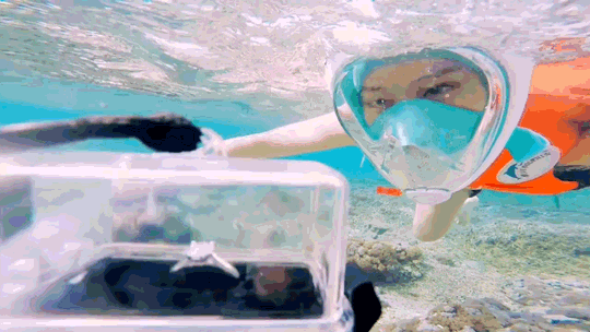 帅气的魏晨戴着一个粉嫩可爱的面罩,准备下水向他心爱的姑娘求婚。脸上写着一些紧张。