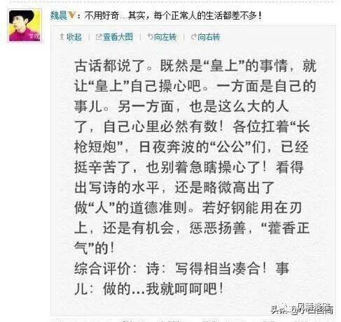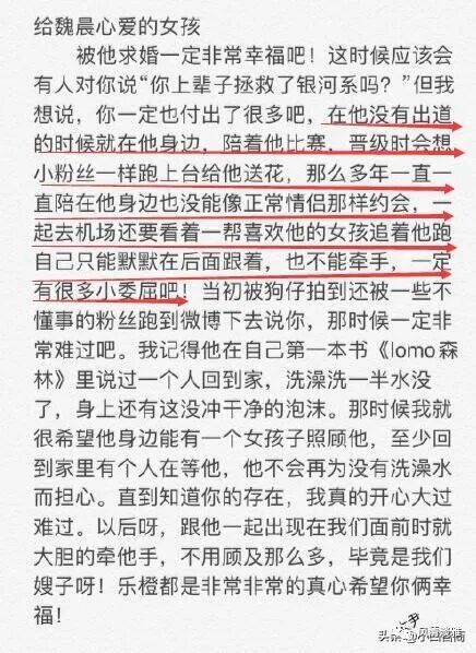 写给爱豆未婚妻的这一段话,也挺戳人的。能感同身受这些年魏晨的未婚妻有多么的不易,要看着自己男友被一帮喜欢他的女孩追着跑,而自己只能在后面默默跟着,也不能牵手。文末还亲切喊魏晨未婚妻为嫂子。
