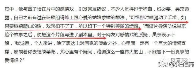 吴京回应这个争议时透露,自己之前有过在珠穆朗玛峰上跟心爱的姑娘求婚的想法,可惜那时候腿动了手术,如果继续爬山就没法拍戏了。所以变成了一个特别美丽的遗憾。