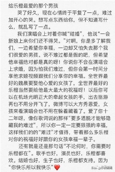 粉丝应该是像信中写的那样,怀着又难过又为爱豆开心的心情写下了这封信。希望自己心中最好的男孩,可以真正的拥有幸福,甚至为他可以大方地和未婚妻秀恩爱而开心。