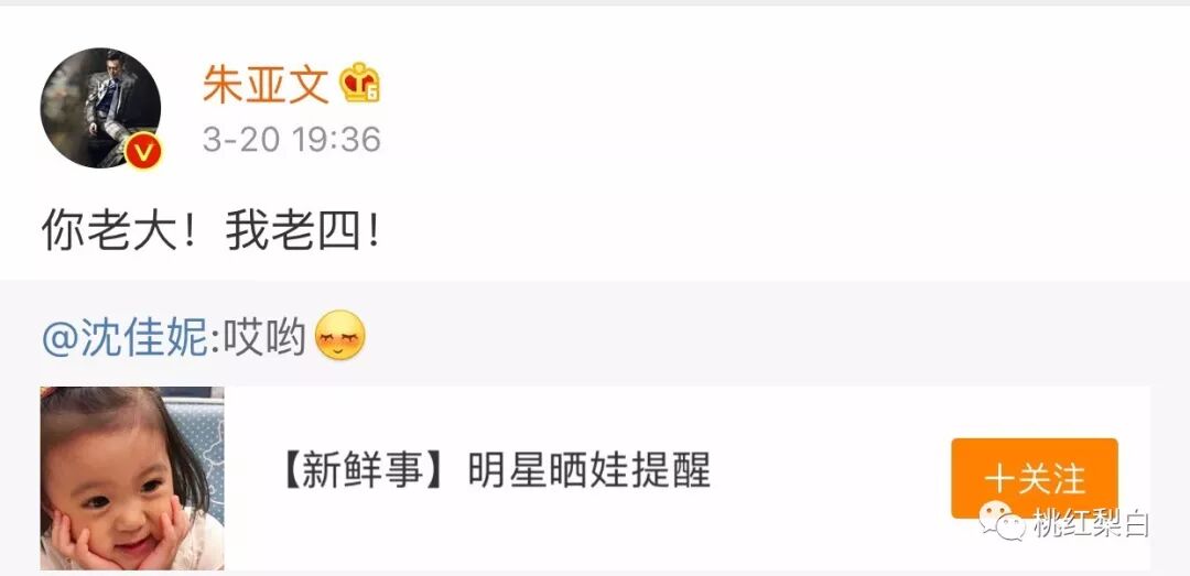 最近朱亚文的妻子沈佳妮怀了第二个bb,朱亚文看起来也是高兴坏了:你老大,我老四!相信不久之后还会出现一个晒娃狂魔。