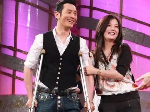 赵薇做客《鲁豫有约》时,因拍戏腿受伤的黄晓明拄着拐杖前来捧场……