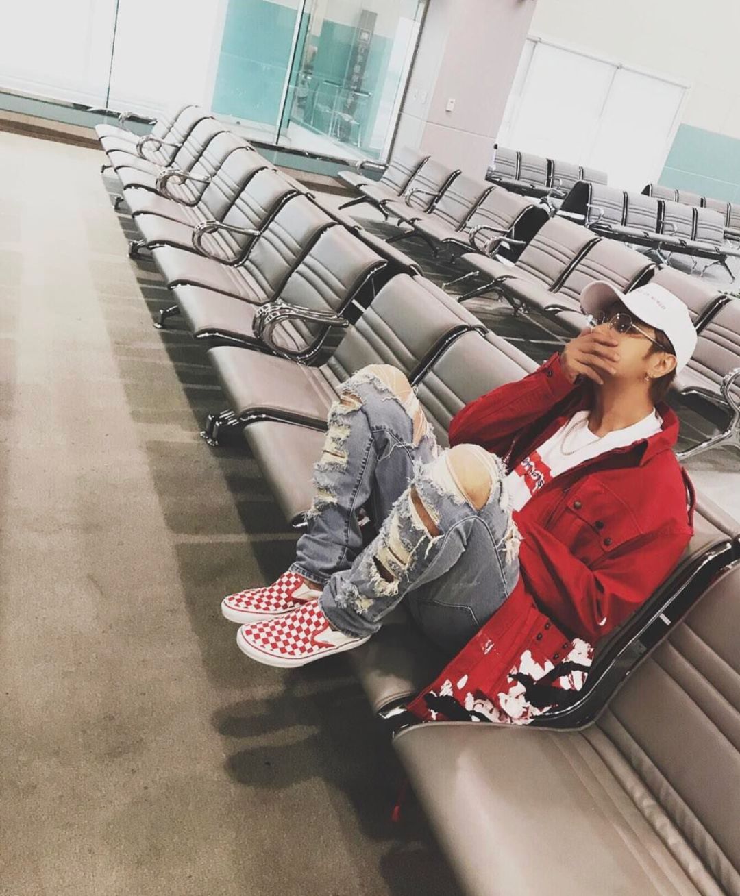 除了那些“高大上”的联名重磅鞋款之外,便宜又经典的Vans Classic Slip-on也是罗志祥的心头好。红色的棋盘格设计与小猪身上cdg x supreme的T恤相互映衬,整体也非常的好看。