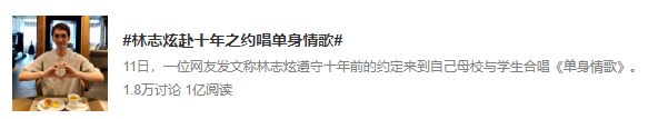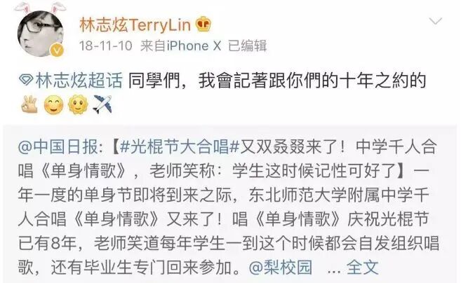 作为原唱的林志炫,两年前曾在微博上允诺:同学们,十年后我跟你们一起唱。
