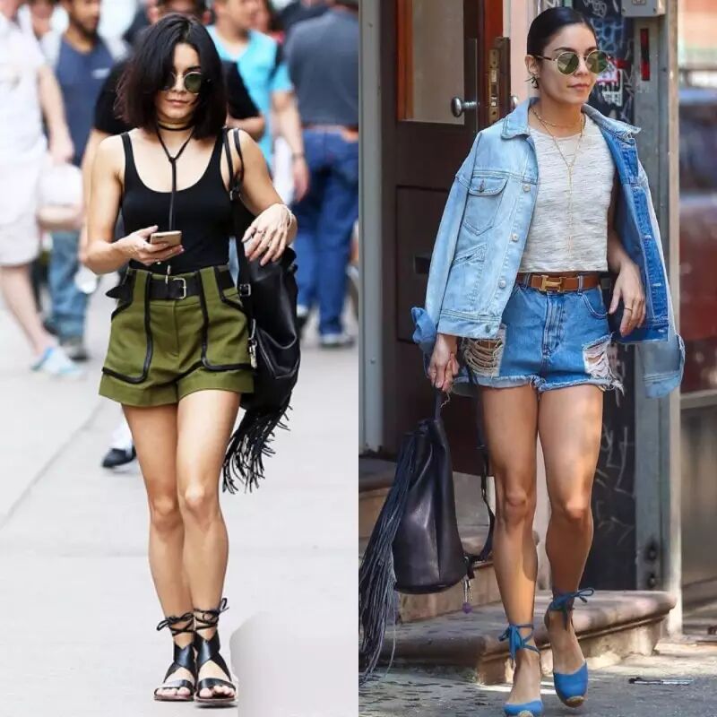 右边街头单宁风。选择单宁牛仔外套和短热裤,短款浅灰内搭做绿叶。这样子的搭配其实我们见得很多了,但是Vanessa出奇地选择了一双水蓝色绑带高跟凉鞋,给整体增色不少。