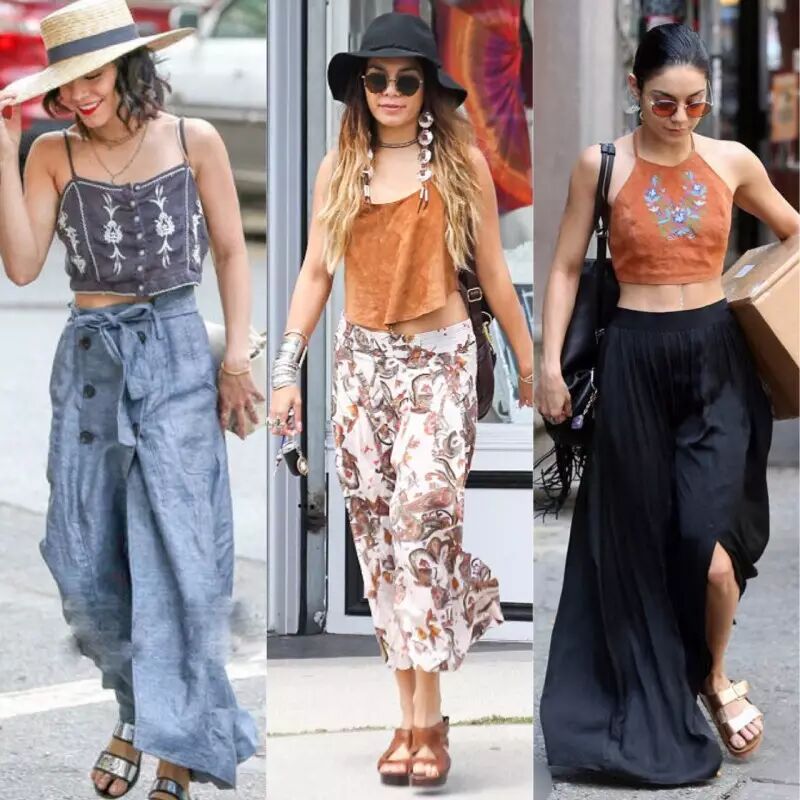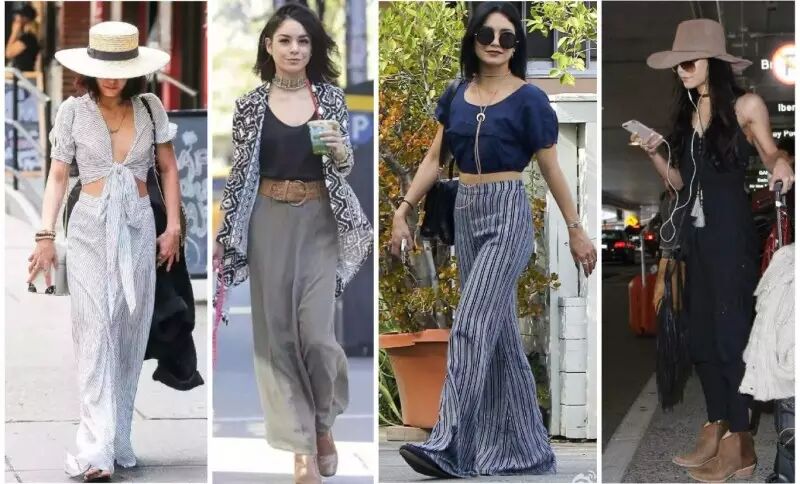 遇到比较飘逸材质的长裤时,Vanessa也会选择拖地款或者适当露出腹部拉长腰线。