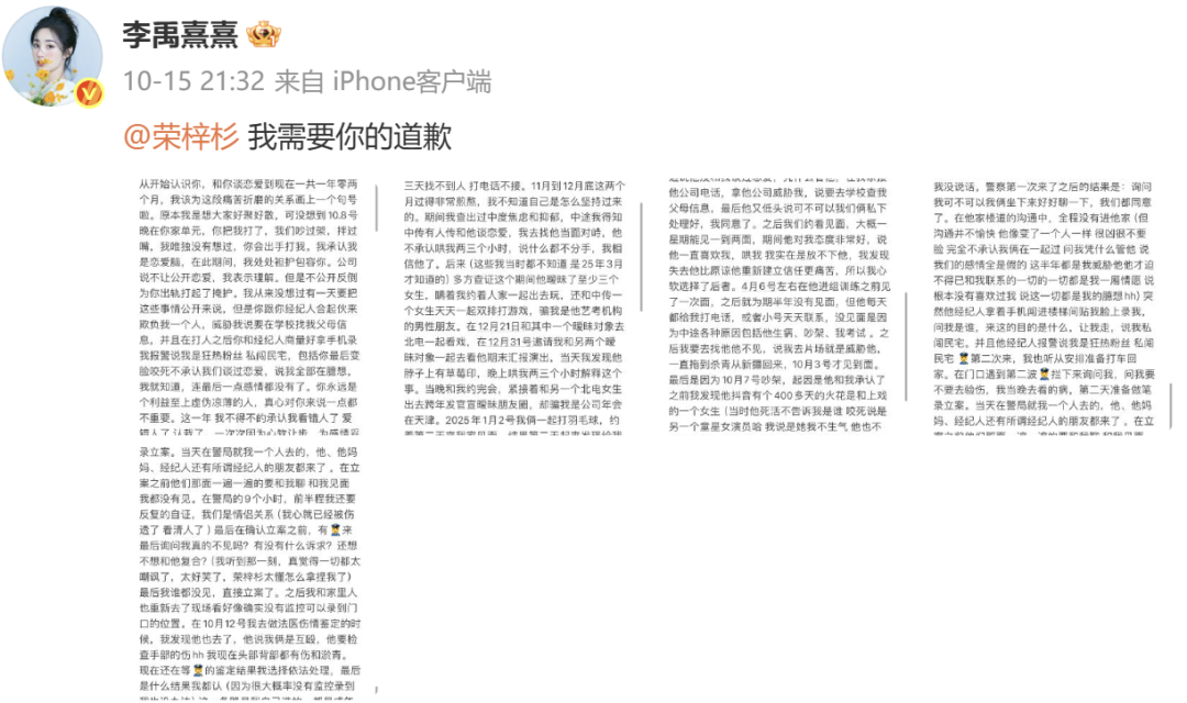 10月15日晚,微博名@李禹熹熹发文,向男演员荣梓杉要一个道歉。