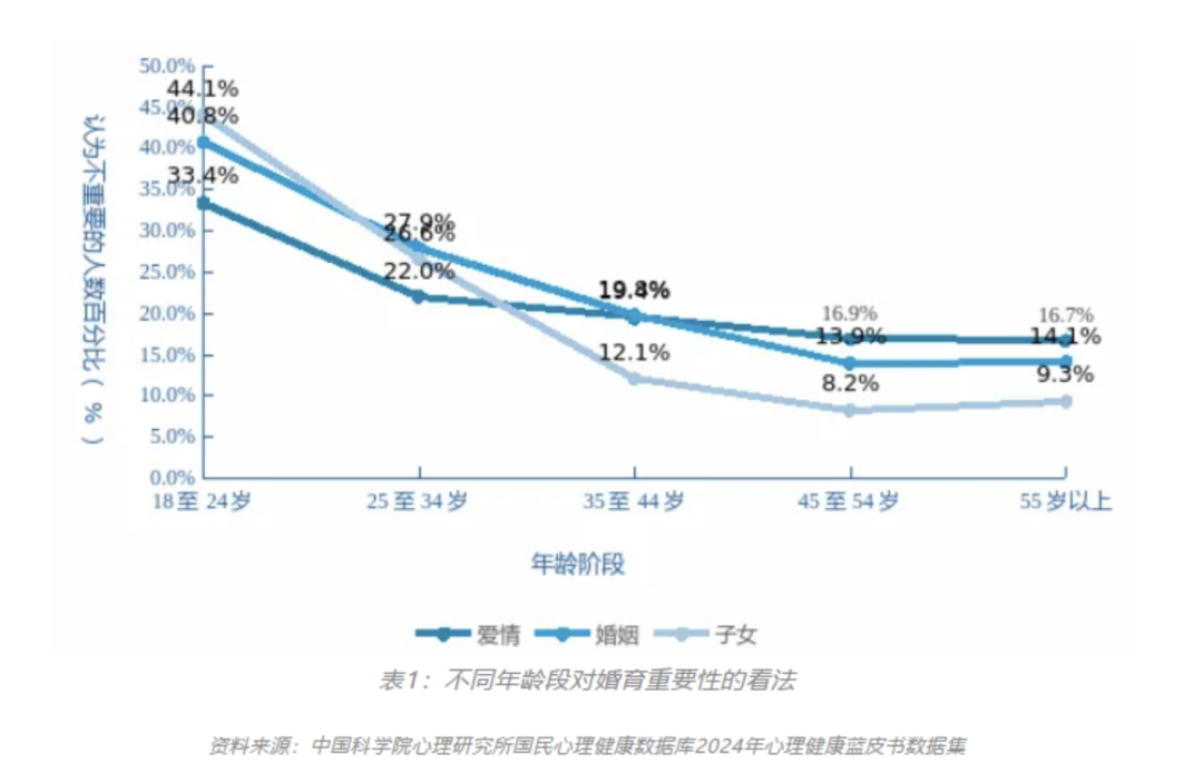 报告显示,在18岁-24岁阶段的成年人中,认为“爱情不重要”的占比33.4%,