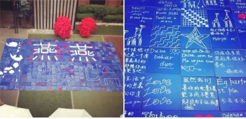 杜江生怕霍思燕觉得是因为自己怀孕才娶她的,于是求婚前杜江特意准备了很久,做了一面爱墙。在这片蓝色瓷砖上写下各种语言的“我爱你”。