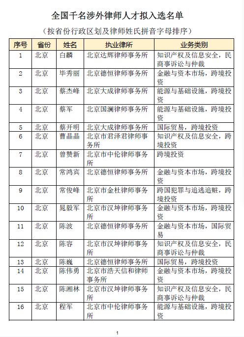 司法部根据《司法部办公厅关于建立涉外律师人才库的通知》(司办通﹝2018﹞59号),组织各省(区、市)司法厅(局)进行入库申报,并对各地申报材料进行集中审核,形成了全国千名涉外律师人才拟入选名单(名单如下)。公示期为2018年8月31日至9月13日(十个工作日)。