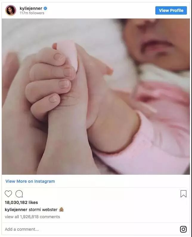 很快一年之后,Beyoncé保持的记录就被卡戴珊家的金小妹Kylie Jenner打破了,今年2月初她在自己的Instagram上宣布产下女儿Stormi Webster时,收到了史上最高获赞记录——1800万+。