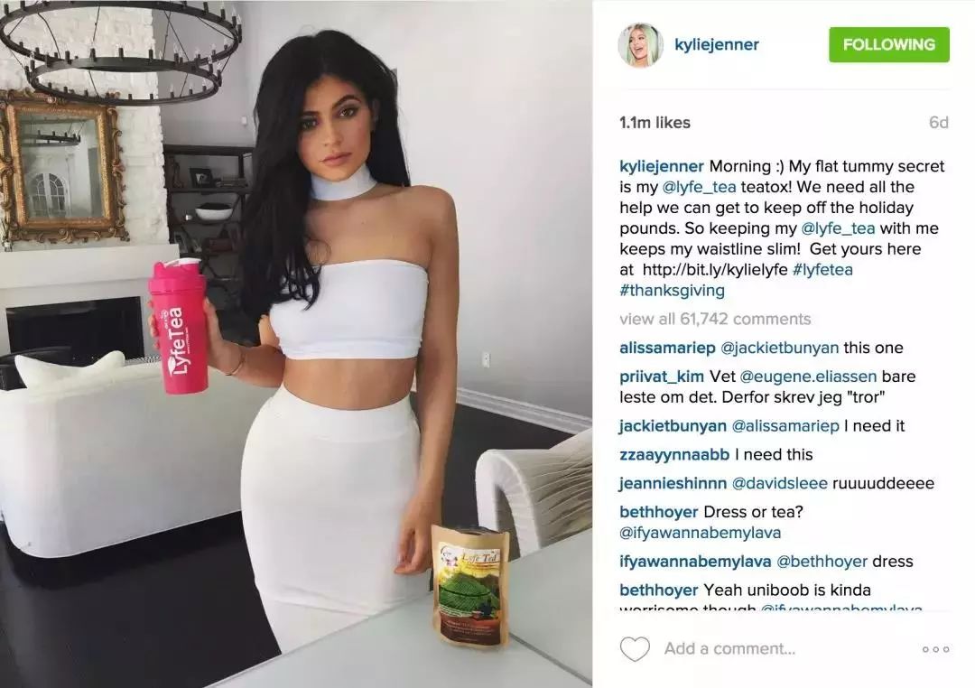 今年,卡戴珊家的金小妹Kylie Jenner,成为福布斯杂志评选出的全美最年轻的靠自己致富的女性,她的身价为9亿美金,除了她一上新就立即断货的自创美妆品牌外,在Instagram上给商家宣传成为她最大的收入源之一。