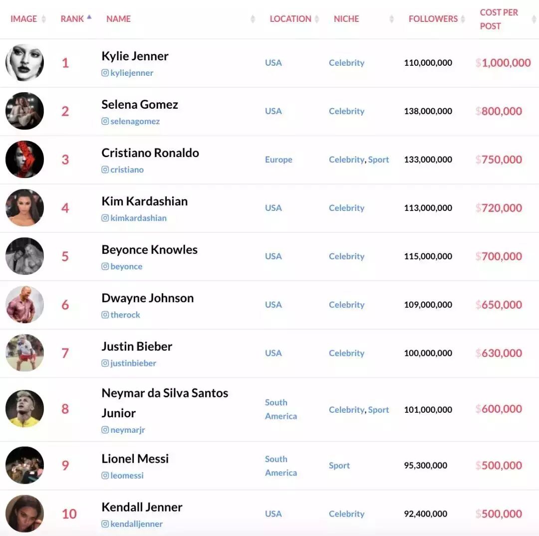 Instagram收入排前12的网红中卡戴珊家独占4位,不得不感慨这一家人精准掌握时代潮流的高超技能...另外上榜的明星还有碧昂斯、贾斯汀·比伯、球星内马尔、梅西、贝克汉姆等一众明星。