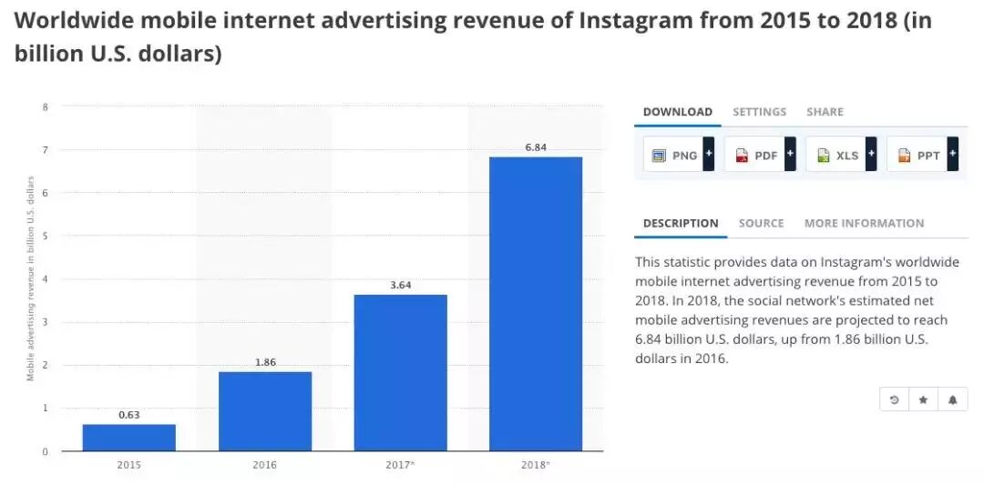 根据statista网站的统计,Instagram的广告收入从2015年的6.3亿美元激增到了2018年的近70亿,这样的增长势头也将继续保持下去,在2019年可能达到108.7亿美元。