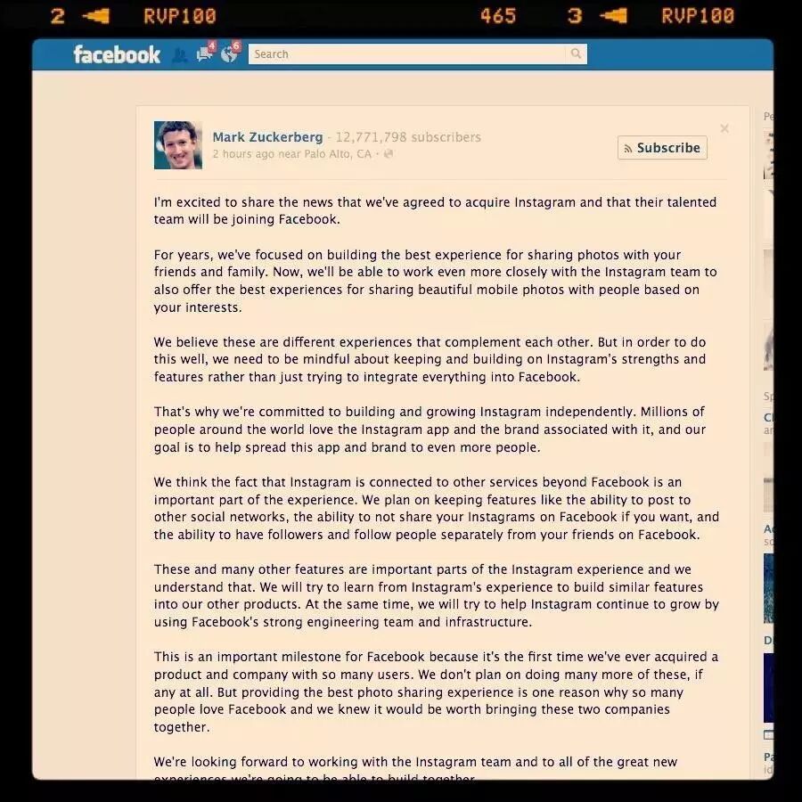 2012年4月9日,马克-扎克伯格(Mark Zuckerberg)宣布,Facebook以10亿美元现金加股票的方式收购Instagram。