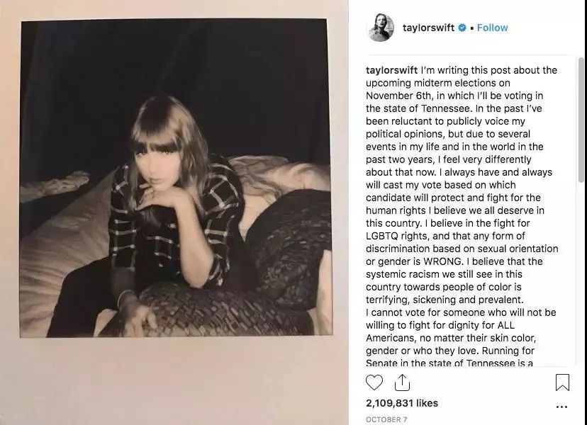 前不久霉霉Taylor Swift在自己的Instagram上发布了一条罕见的打破政治沉默的长篇声明,她表示自己在11月的美国中期选举中支持两位民主党候选人,并号召粉丝们都能行使自己的投票权、参与中期选举,用自己的实际行动改变美国。