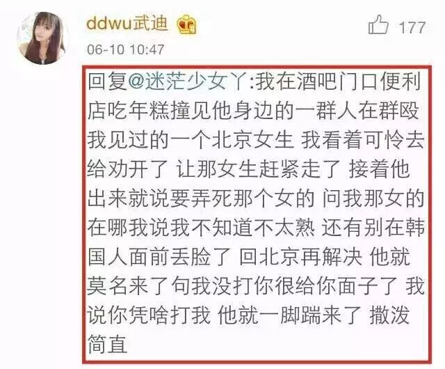 是的,就是这个事了,以后见你一次打你一次。打的是什么人?一个叫武迪的,女的,我只知道这些,长得挺像样的,当然,挺像样的下面总是跟着一堆人说她是整容的。