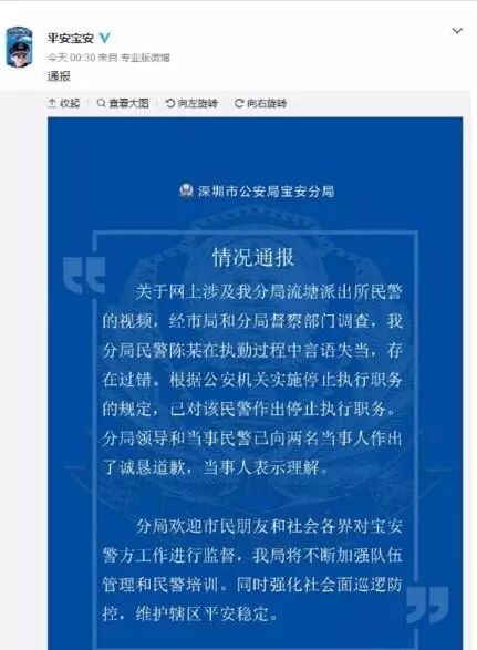 宝安分局领导和当事民警已向两名当事人作出了诚恳道歉,