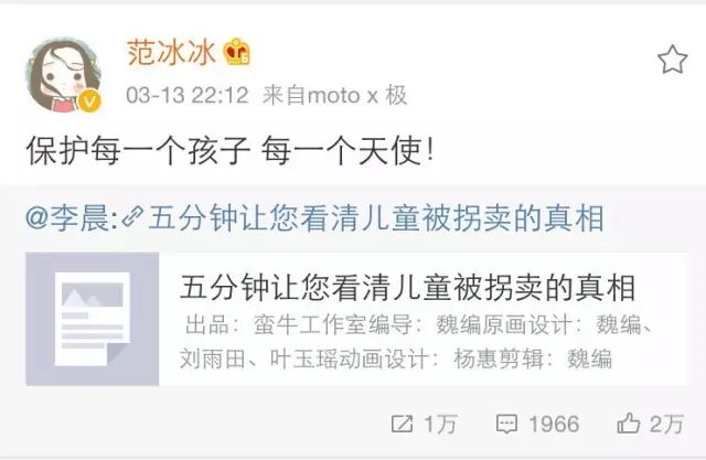 近日,范冰冰转了李晨一条微博,是关于国内拐卖儿童的视频,视频只有五分钟,看完让人有种说不出的难受...