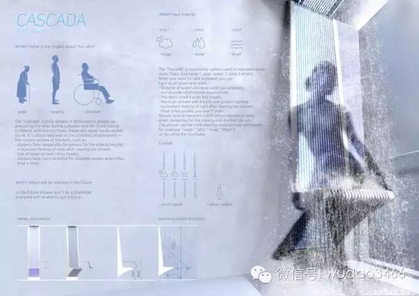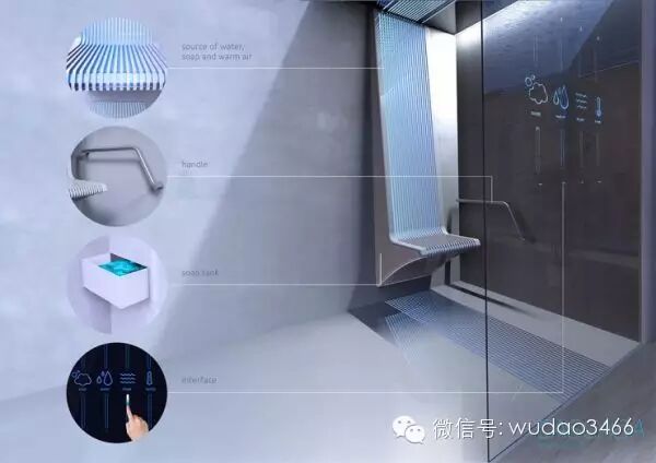 中国IDC圈8月7日报道:Cascada 淋浴间是设计师 Martyna Mieszko 专门为上年纪的老人、腿脚不方便的人、残疾人以及一些上班太累的小年轻打造的,坐在 淋浴座椅上基本上不用动,澡就洗完了。Martyna Mieszko 的设计灵感来源于无接触洗车的过程,泡沫清洗→水流冲洗→烘干。因而她所设计的 Cascada 淋浴间自动洗浴过程也是如此: