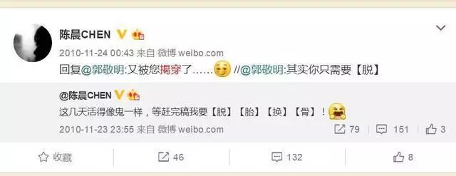 2010年11月23日,郭敬明旗下男作家陈晨发微博:“等赶完稿我要【脱】【胎】【换】【骨】!”,郭敬明的评论充满了内涵和暗示:“其实你只需要【脱】”,陈晨则害羞表示:又被您揭穿了。