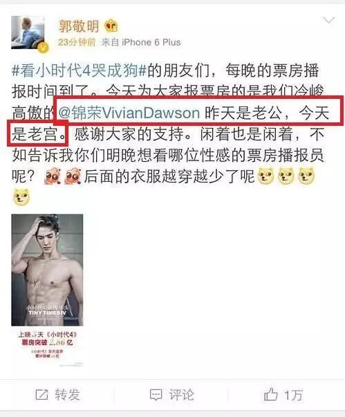 《小时代4》上映时,郭敬明曾在微博发男模锦荣(主演之一)的性感照片播报票房,有句话让人想入非非:“锦荣昨天是老公,今天是老宫”。