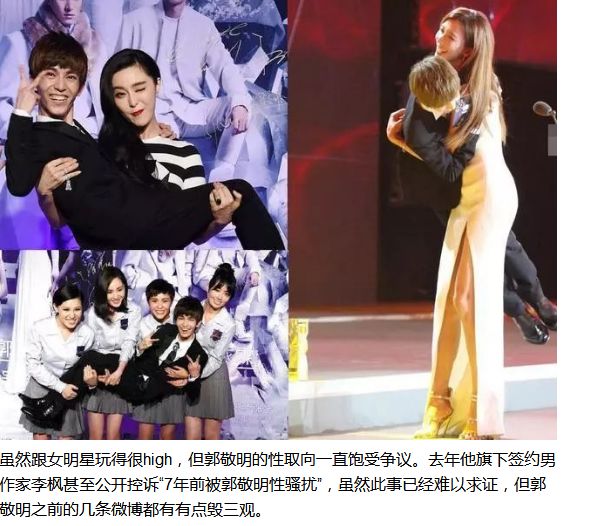 虽然“其貌不扬”,但郭敬明可谓“艳福不浅”啊,跟各种一线女星都亲密接触过:穿着高跟鞋的林志玲抱起他来转圈圈,范冰冰给他公主抱,杨幂、谢依霖、郭碧婷、郭采洁四个女神一起抱……