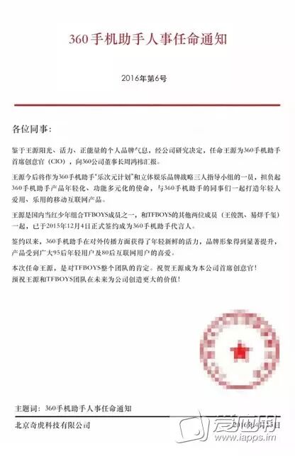 近些年来,影视娱乐明星入职互联网大公司俨然成为一股风潮,高晓松、宋柯、何炅等明星入职阿里巴巴,而在奇虎 360,包括易烊千玺、李湘等明星也纷纷跨界任职,此次曝出王源担任 360 手机助手首席创意官,或将对 360 手机助手未来产品形态、市场营销产生深远影响。