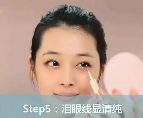Step5:在下眼线紧紧贴合眼睑,涂上珍珠白色的眼线液,画出仿佛眼角含泪楚楚可人的清纯眼妆,这可是打造清纯妆容的秘诀所在哦。
