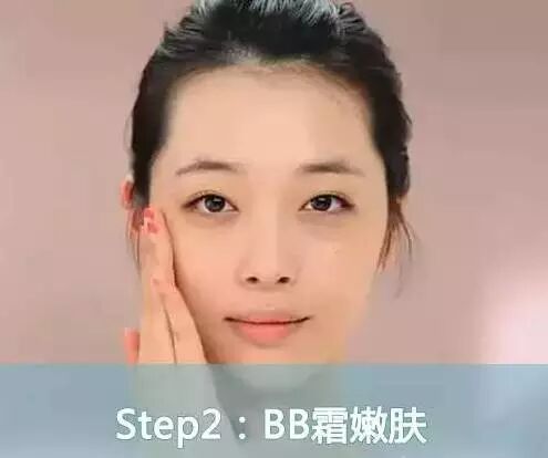 Step2:把和皮肤颜色对应的BB霜用手扫过并贴紧,涂抹在脸部。鼻子,额头,下巴等立体部位多涂一层BB霜,会显得更加立体哦,用手掌轻柔地将全脸均匀的包裹,可以防止BB霜浮起。用手掌的温度让底妆更加服帖。