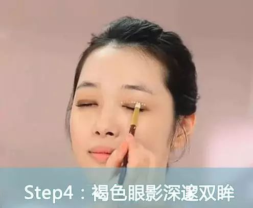 Step4:用褐色眼影创造出浓郁的眼妆!将浅褐色眼影在眼窝处大幅度扫上,打造出有深邃的眼型;将棕色的眼影混合在后,用眼影刷在双眼皮上扫上。