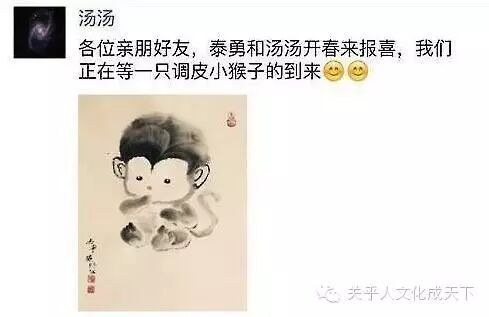 别的明星都在努力的借“怀猴子”大炒一把,汤女神巧妙的避开了所有狗仔的镜头,用自己父亲的一幅水墨画告诉外界自己怀了个猴子